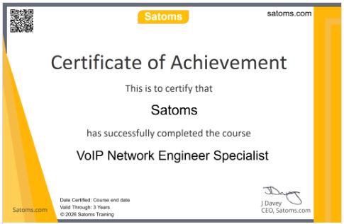 You will receive a Satoms issued “VoIP Network Engineer Specialist” certificate upon successful completion, recognizing your skills and knowledge in VoIP design, deployment, QoS, security, and troubleshooting.